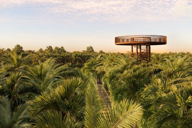 The design is structured around three primary courtyards, each responding to the natural rhythms of the palm trees and local climate. These outdoor areas function as social anchors, promoting informal gatherings and facilitating community interaction. The East Gate zone stands out as the main activation point, featuring food and beverage outlets, retail kiosks, and integrated seating, all designed to blend seamlessly into the landscape.