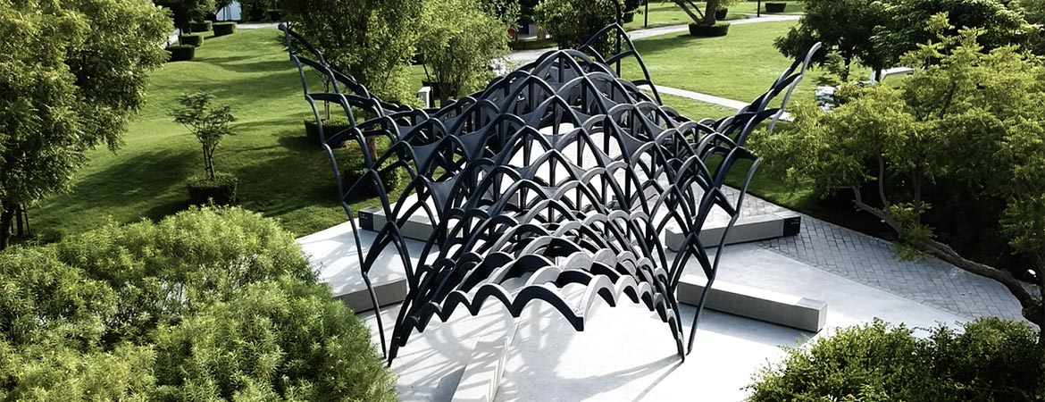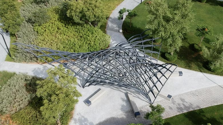 The Al Janah (which means ‘wing’ in Arabic) Pavilion was designed and developed during the 2018-2019 academic year by AUS students enrolled in a design studio course that was part of a collaboration between Arada and the university. Led by Associate Professor Jason Carlow, students investigated and developed methodologies for designing roof canopies for extreme desert climates. One student, Aya Rahmy, whose conceptual design was adopted and refined, has since graduated from AUS and is now working as a Junior Architect with Arada.