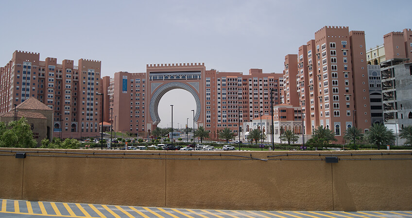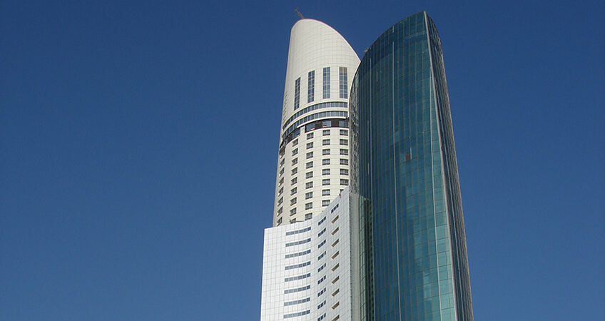 To be found adjacent to the Ibn Battuta Mall at Jebel Ali in Dubai, this 200,000 m² complex comprises offices, apartments, and a five-star Mövenpick hotel that offers 396 guest rooms 156 furnished apartments, 15 themed suites, and an extensive spa. The arch-shaped gate building connecting the two main buildings spans across a four-laneroad. Continued maintenance traffic over this road and the proximity of the operational mall meant that BAM International had a major challenge in keeping the immediate surroundings safe while construction took place up to a height of 60 metres.