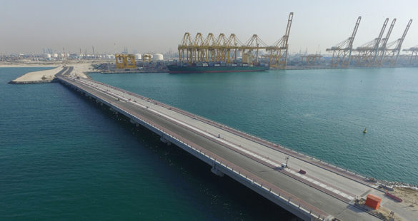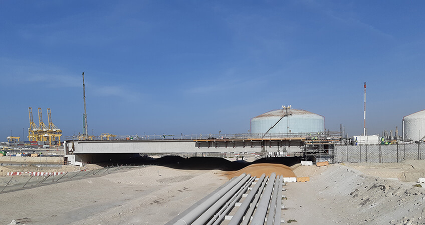 A design and construct contract to deliver a road connection between the newly constructed Container Terminal 4 and the existing road network. The project includes the design and construction of 2.75 km of dual carriageway with one roundabout and bridge crossing the existing gas utility corridor. For the bridge we designed and constructed the biggest AASHTO bridge beams ever used in the UAE, The works comprise associated drainage, lighting, signage including gantry signs, road markings and precast barriers. The project will form the first step in a much larger Infrastructure upgrade DP World plans to implement in Jebel Ali Free Zone within the future.
