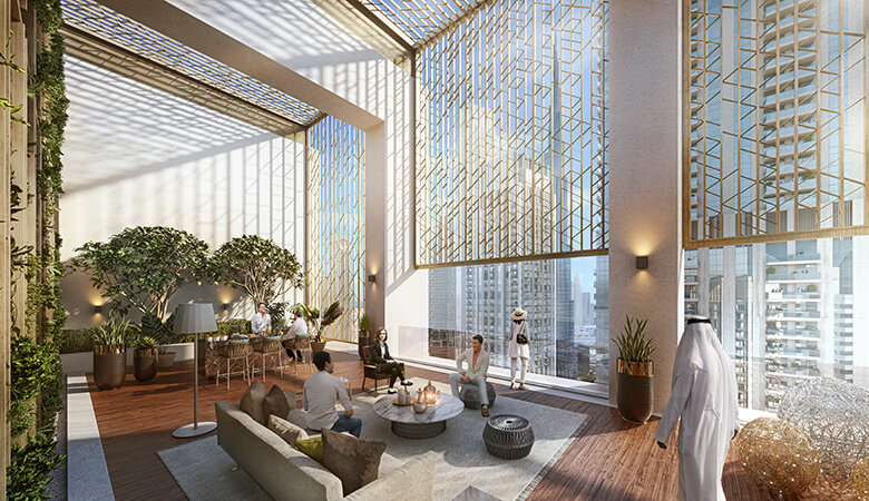 The Crown at the top of the building presents itself to the city from afar, a bronze filigree, punctuating the tower’s presence amongst its prestigious neighbours. Burj Crown features an ‘Active Roof’ area which provides residents with a communal outdoor space with magnificent views of Burj Khalifa and across Dubai.