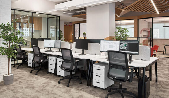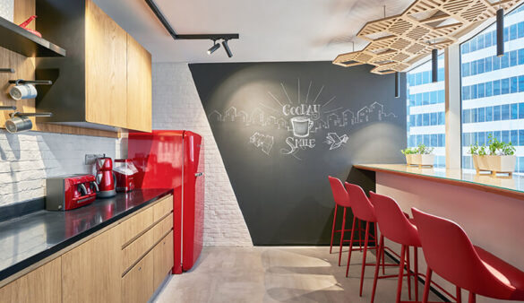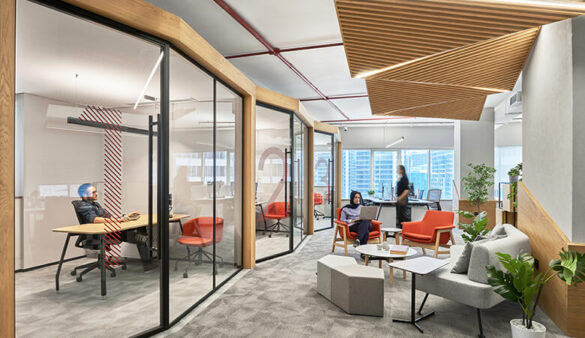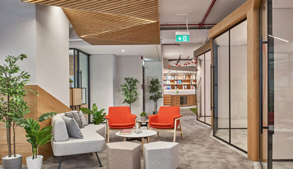 Private pods have been used throughout to suggest small buildings, a design feature that pays homage to the nature of the practice. These workstations can also be adjusted to the employees’ needs, creating a collaborative atmosphere to connect, brainstorm and exchange ideas. ATI’s design team made sure that its staff, who are sometimes working long hours, stay comfortable when sitting by utilising ergonomic chairs.