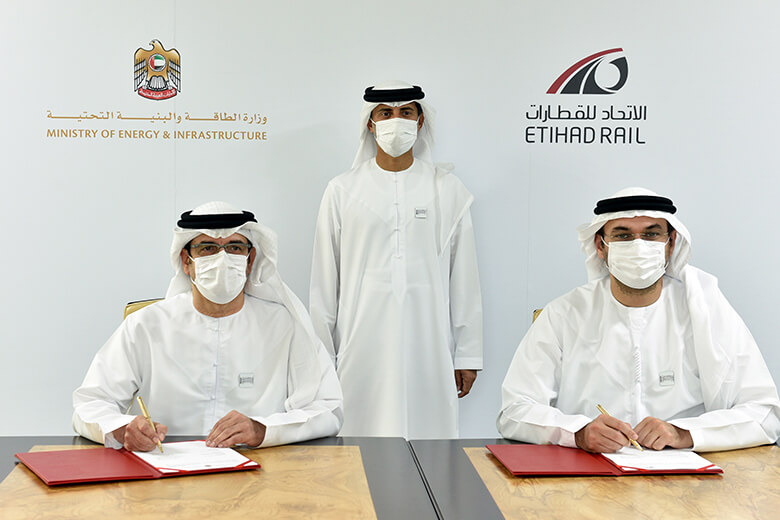 The agreement was signed at the Ministry’s office in Dubai in the presence of His Excellency Suhail bin Mohammed Faraj Faris Al Mazrouei, Minister of Energy and Infrastructure. The agreement was signed by His Excellency Eng. Hassan Mohammed Juma Al Mansouri, Under-Secretary of the Ministry of Energy and Infrastructure, and Shadi Malak, Chief Executive Officer of Etihad Rail, and was attended by representatives from both organisations.